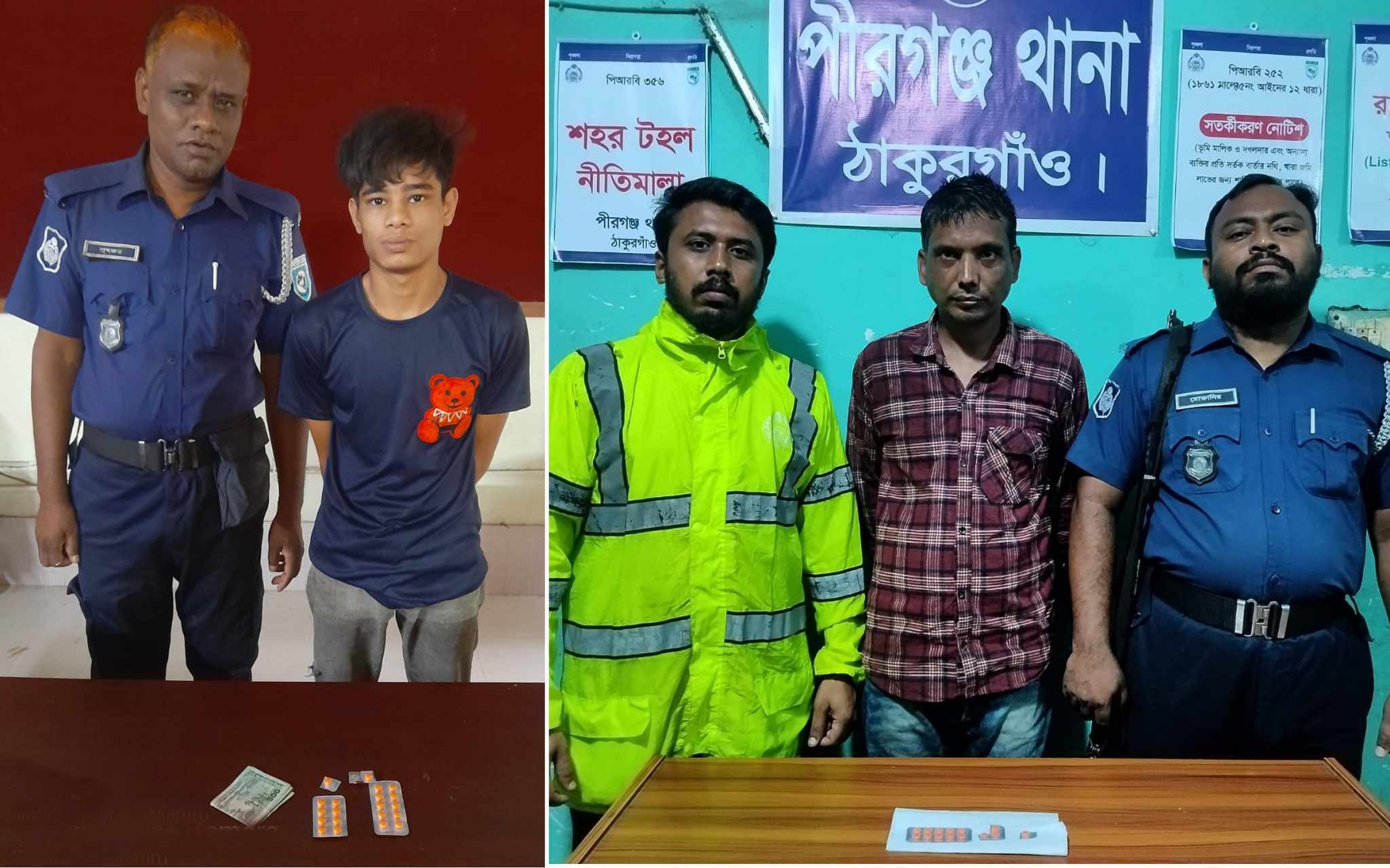 ঠাকুরগাঁও সদর থানা পুলিশ সদর উপজেলার নতুন গড়েয়া বাজার এলাকায় অভিযান পরিচালনা করে। এ সময় ওই গড়েয়া চোঙ্গাখাতা শাহাপাড়া গ্রামের মো: আনোয়ার হোসেনের ছেলে মোঃ জাহিদ আলম (১৯) কে ২২ পিচ ট্যাপেন্টাডোল ট্যাবলেটসহ গ্রেফতার করা হয়। অন্যদিকে পীরগঞ্জ পৌরসভার মিত্রবাটি ভাই ভাই ক্রোকারিজের সামনে মাদকবিরোধী অভিযান পরিচালনা করা হয়। এ সময় পীরগঞ্জ উপজেলার চোপড়া গ্রামের মৃত আনিসুর রহমানের ছেলে মো: নূরনবী (৩০) কে ১৪ পিস ট্যাপেন্টাডোল ট্যাবলেটসহ গ্রেফতরা করা হয়।