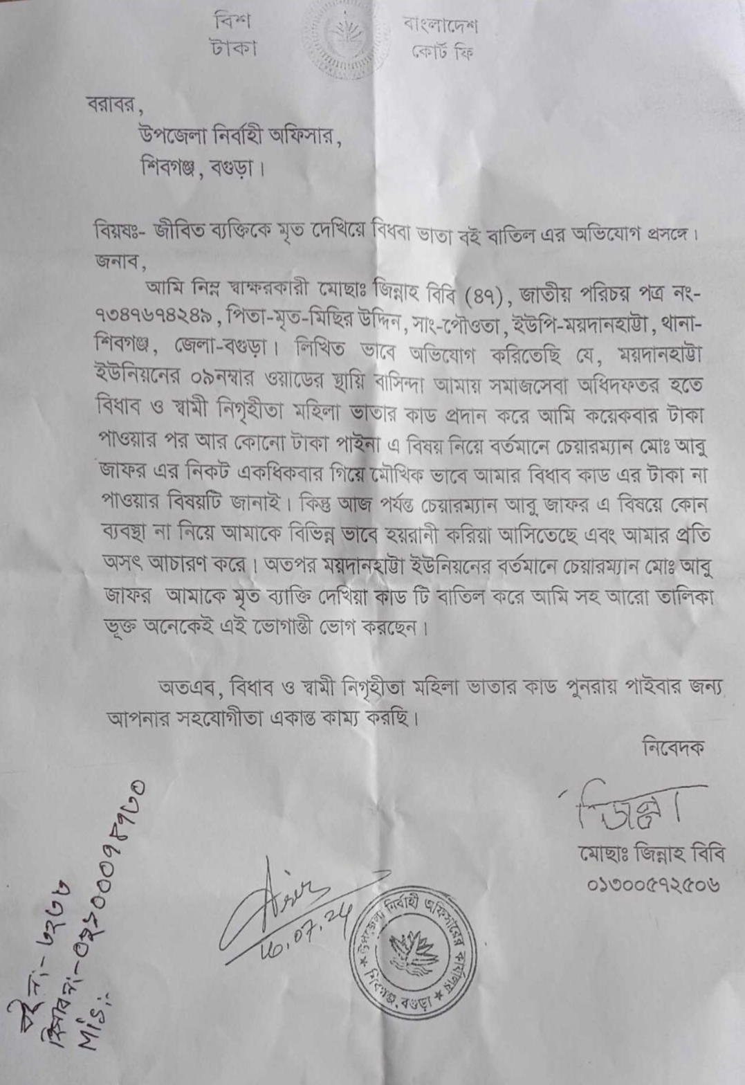 জিন্নাহ বিবি জানান, আমার স্বামী মারা যাবার পর সমাজ সেবা অফিস থেকে বিধবা ও স্বামী নিগৃহিতা ভাতা কার্ড পাই। কার্ড পাওয়ার পর দুইবার ভাতার টাকা পেয়েছি। এরপর থেকে কয়েক ধাপে আমার মোবাইল ব্যাংক একাউন্টে কোন টাকা আসেনি। গত রবিবার শিবগঞ্জ উপজেলা সমাজ সেবা অফিসে গিয়ে বিষয়টি জানতে চাইলে সেখানকার কর্মকর্তারা জানান, ময়দানহাট্টা ইউনিয়ন পরিষদের চেয়ারম্যান আবু জাফর মন্ডল আপনাকে মৃত দেখিয়েছেন। তাই আপনার কার্ড বাতিল হয়েছে। এরপর কয়েকবার ইউনিয়ন পরিষদের চেয়ারম্যানের সাথে যোগাযোগ করেছি। কোন সমাধান পাইনি।