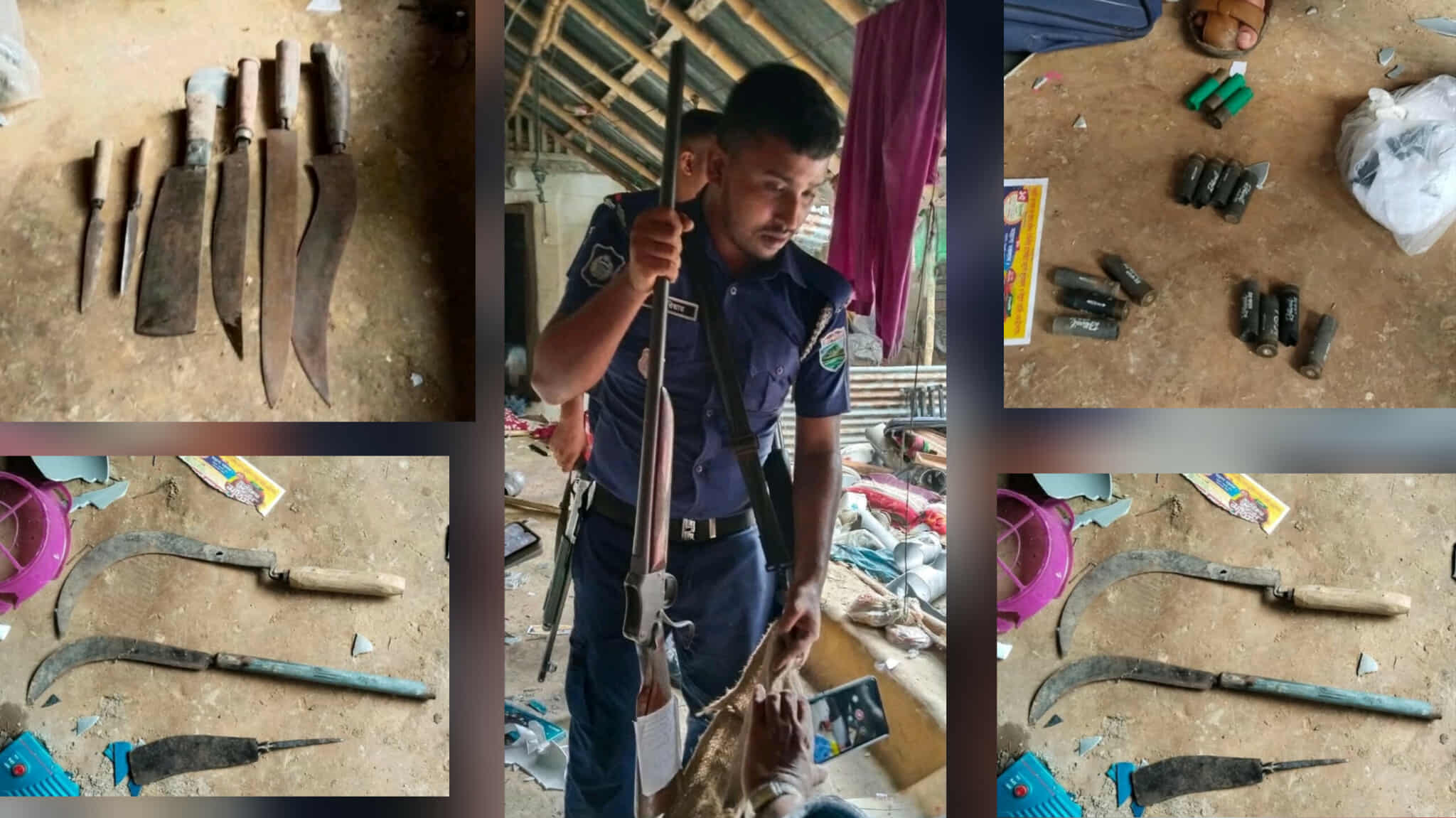 পরে খবর পেয়ে অতিরিক্ত পুলিশ সুপার মোস্তফার নেতৃত্বে অতিরিক্ত ফোর্স ঘটনাস্থলে গিয়ে পরিস্থিতি নিয়ন্ত্রণে আনে। এ সময় আসামির বাড়ি থেকে একটি লাইসেন্সকৃত একনালা বন্দুক, একটি তাজা গুলি, ১৫টি ব্যবহৃত কার্তুজ উদ্ধার করা হয়। এছাড়া বাড়ি থেকে রামদা, চাইনিজ কুড়াল, হাসুয়া, বড় সাইজের ছুরি, চাকুসহ প্রায় ৩০টি দেশি অস্ত্র উদ্ধার করে পুলিশ।