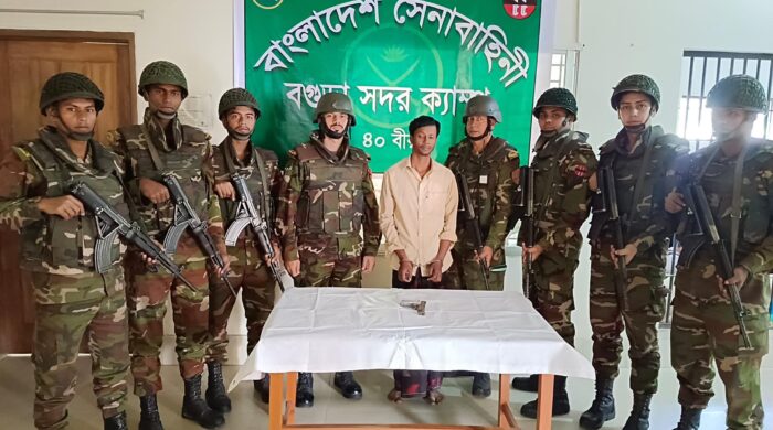 মিরু হাসান, স্টাফ রিপোর্টার: বগুড়ায় গুলি ও বিদেশী পিস্তলসহ কৃষকলীগ নেতাকে গ্রেপ্তার করেছে যৌথবাহিনী। বৃহস্পতিবার দিবাগত রাত দেড়টার দিকে শাজাহানপুর উপজেলার আশেকপুর পশ্চিমপাড়া এলাকা থেকে তাকে গ্রেপ্তার করা হয়৷ গ্রেপ্তার